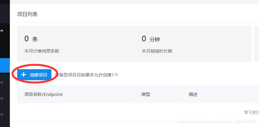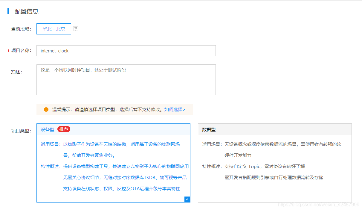 点击创建项目,设备项目分为两种,设备型项目和数据型项目,设备型项目允许创建一个,数据型设备允许创建9个。两者区别在于设备型项目适用于大多数情况,自动配置数据库,可添加话题等等。数据型项目可以使用户完成定制化的服务,当然也更难配置,一般情况下使用设备型项目就可以了。关于两者介绍请看天工官网。