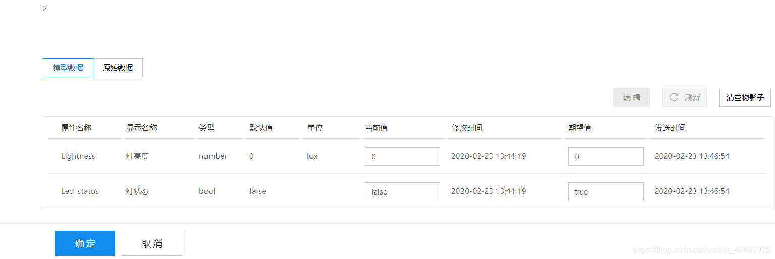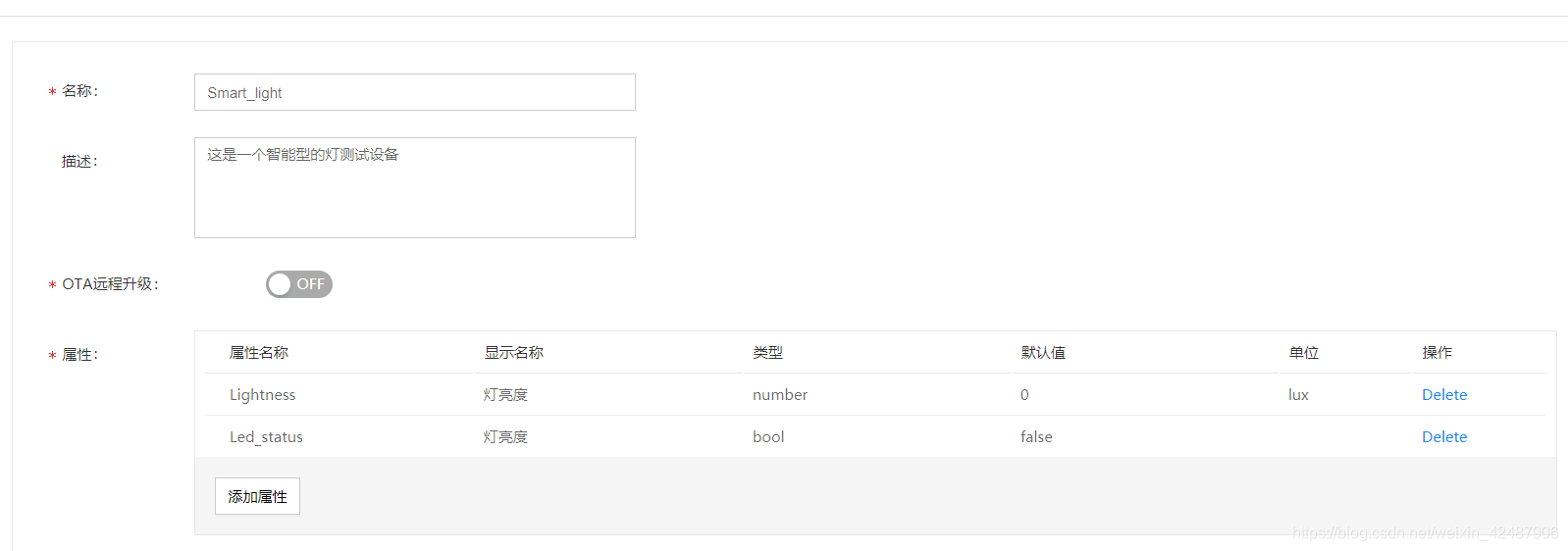 上图是物模型的配置界面,在配置界面中需要添加物模型的属性,这些属性是用来操作物影子的相关功能的。