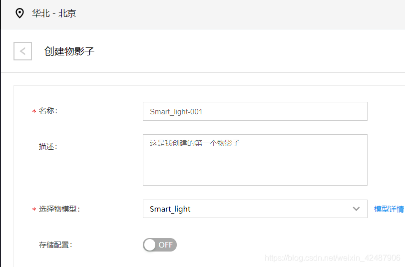 创建物影子的时候要设置相应的物模型,这个地方存储配置先不勾选,这个是用来配置是否使用时序数据库的,这个地方暂时用不到。