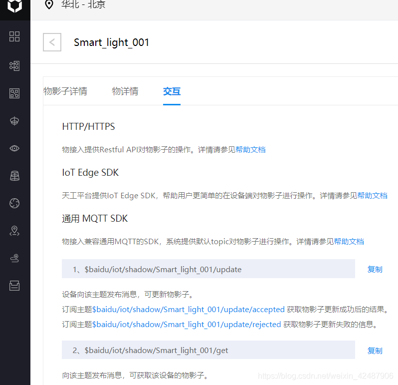 每一个物影子都有相应的访问网址和用户名和密码,这个是物联网设备端与云端通讯时必备的信息。必须妥善保存,待会我们也会用到。