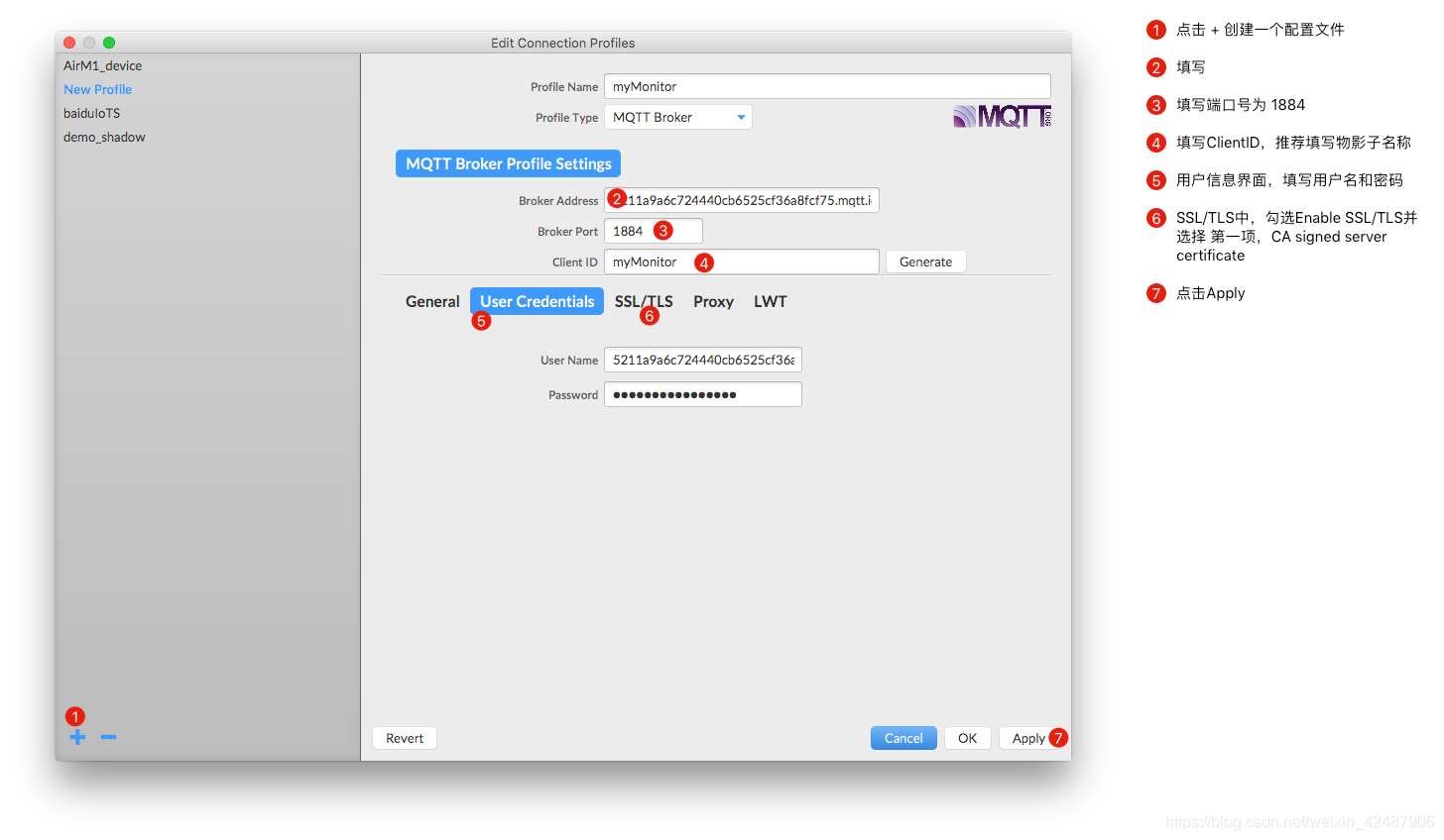 打开mqtt.fx,按照上图进行配置,不过密码什么的要改成自己的,这些信息就是刚刚创建物影子时生成的信息。