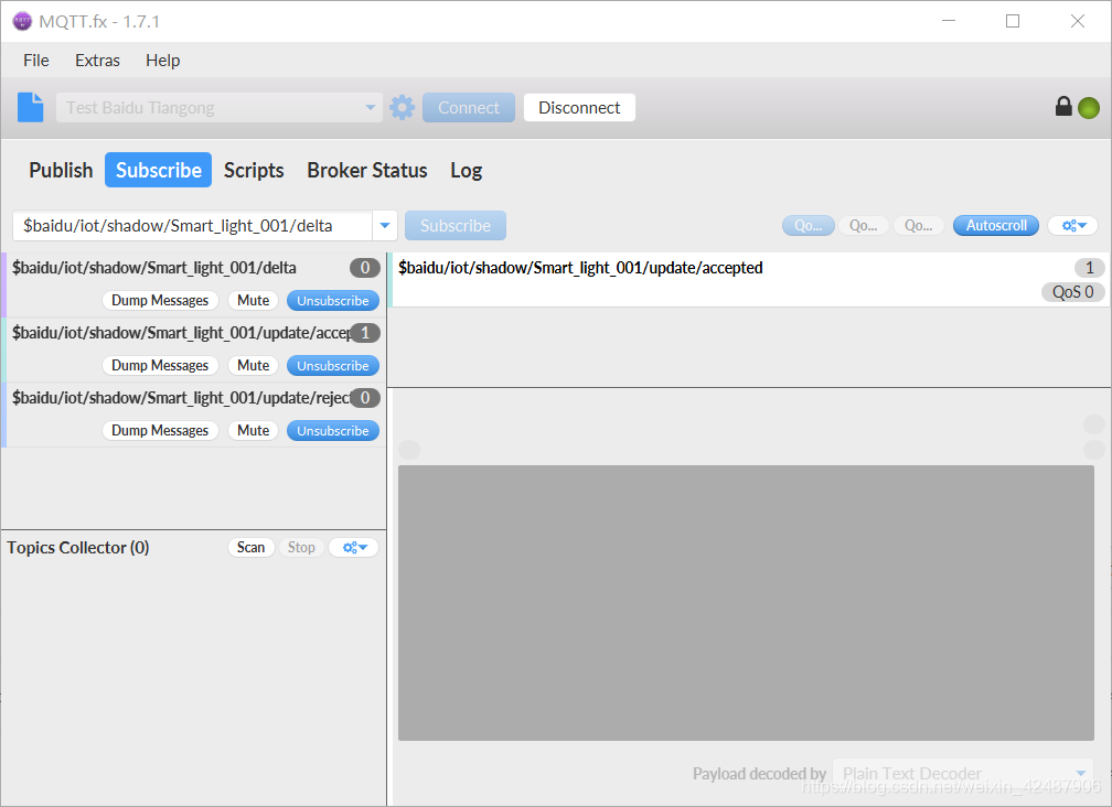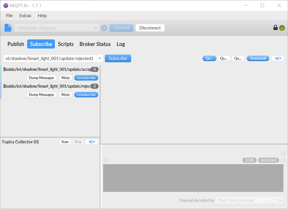 创建好后点击Connect,如果界面右侧的绿灯亮起,则说明链接成功,这时候打开云天工,发现对应的物影子上面的灯也亮了,说明使用mqtt.fx链接云天工成功。