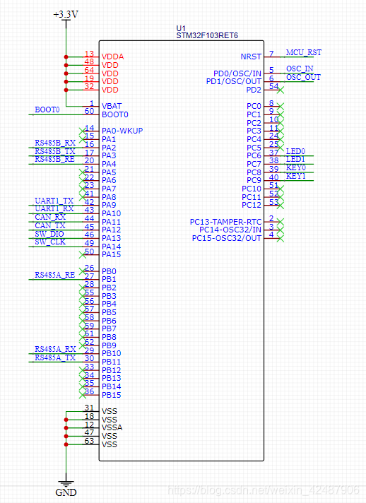 由于开发时间比较短,我采用了我最常用的STM32F103RET6,它拥有一个CAN控制器,64kRAM,256kROM,满足需求,实际上RAM用不到这么大,毕竟现在芯片这么贵,其实完全可以采用相同功能但是RAM更小更便宜的芯片