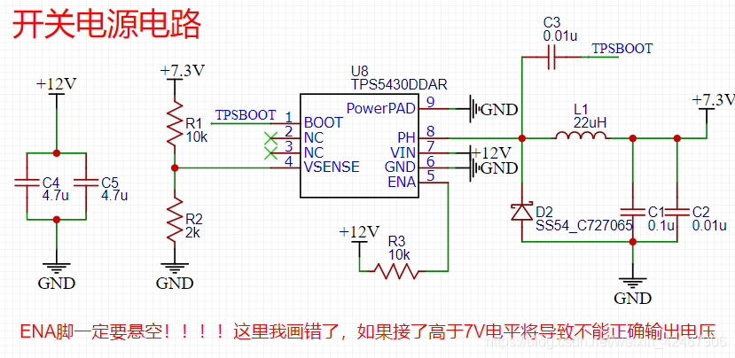 - 这里设计的时候我设计出现了一个问题,板子到了后发现7.3V电压无法正常输出,通过查看数据手册发现ENA浮空就好了。